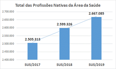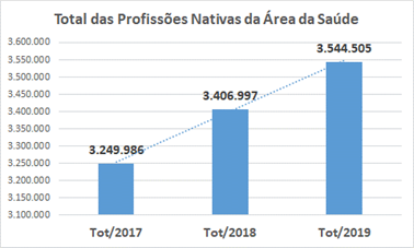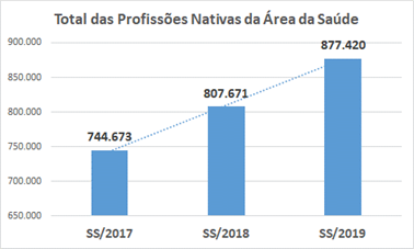É importante iniciar com este gráfico, ressaltando que o número total de profissionais do segmento da área da saúde cresceu ... e muito .. nos últimos anos. Este gráfico, que se refere apenas as profissões nativas da área da saúde, demonstra um crescimento total de vagas de 294.519 vagas entre 2017 e 2019, ou seja, quase 300 mil novas vagas em apenas 2 anos !