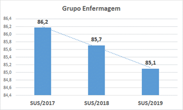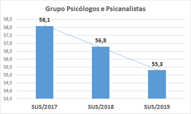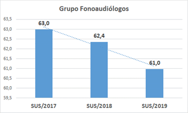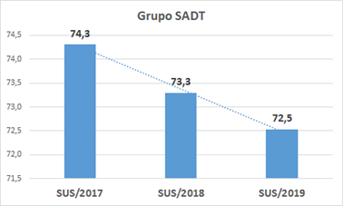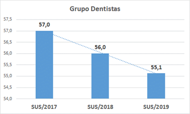 Este gráfico demonstra que em 2017 os postos de trabalho no SUS representavam 77,1 % do total, e em 2019 caiu para 75,2 % ...